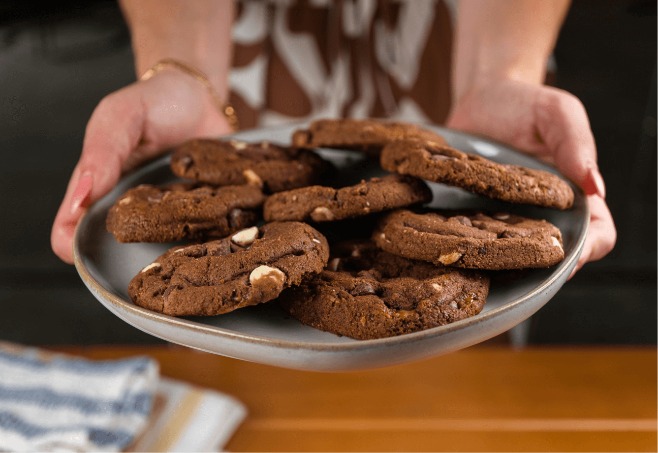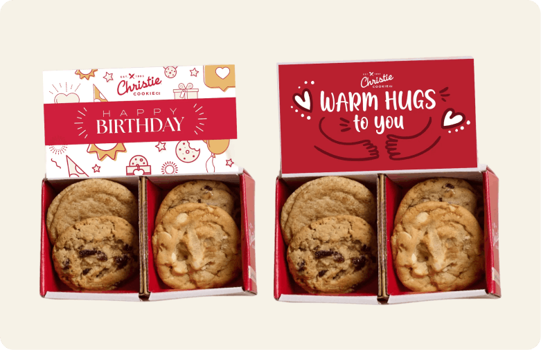 4 × 2.4 oz gourmet cookies in a charming gift box. Includes Snickerdoodle, Chocolate Chip, White Chocolate Macadamia, and Oatmeal Raisin—perfect for gifting or treating yourself.