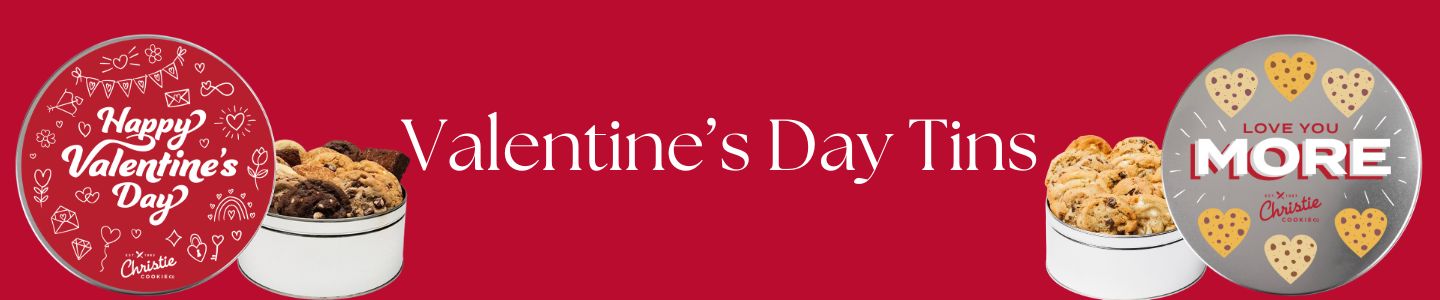 Make Valentine's Day extra special with Christie Cookie Co's Valentine's Day Tin section. Our specially designed tins convey festive cheer with bold Valentine's Day messages in two delightful designs. Celebrate the occasion with our Classic Assortment gourmet cookies, adding a touch of sweetness to the festivities. With our "Love You More" and "Valentine Charms" tins, there is a unique way to send Valentine greetings to loved ones near or far. Each tin is filled with a mouthwatering mix of Chocolate Chip, Oatmeal Raisin, and White Chocolate Macadamia Nut Cookies. We also offer our popular Greatest Hits Tin, which includes a delicious assortment of our fan favorite cookies along with two rich and fudgy Chocolate Brownies. This tin gives you another thoughtful way to share a sweet Valentine surprise that feels generous, memorable, and perfect for anyone who loves premium baked treats. Whether you are surprising a loved one or treating yourself to a Valentine's Day indulgence, these themed tins offer a thoughtful and delicious way to send best wishes. Each tin is handcrafted to make sure your recipients receive a memorable gift that they will not soon forget. Our cookie assortments are the perfect way to send a sweet hello to friends or family near or far, and our memorable tins ensure your gift will leave a lasting impression. With nationwide delivery, we make sure that your gifts arrive worry free and right on time for every special occasion. All cookies and brownies are made with 100 percent butter and are full of premium ingredients for expertly crafted, quality treats you will feel good about gifting. Each beautifully crafted tin includes a custom gift message at no additional charge, so you can be sure that your tins will arrive with every sentiment intended. Choose from our uniquely crafted designs to make every Valentine's Day celebration memorable with the delectable taste of Christie Cookie Co.